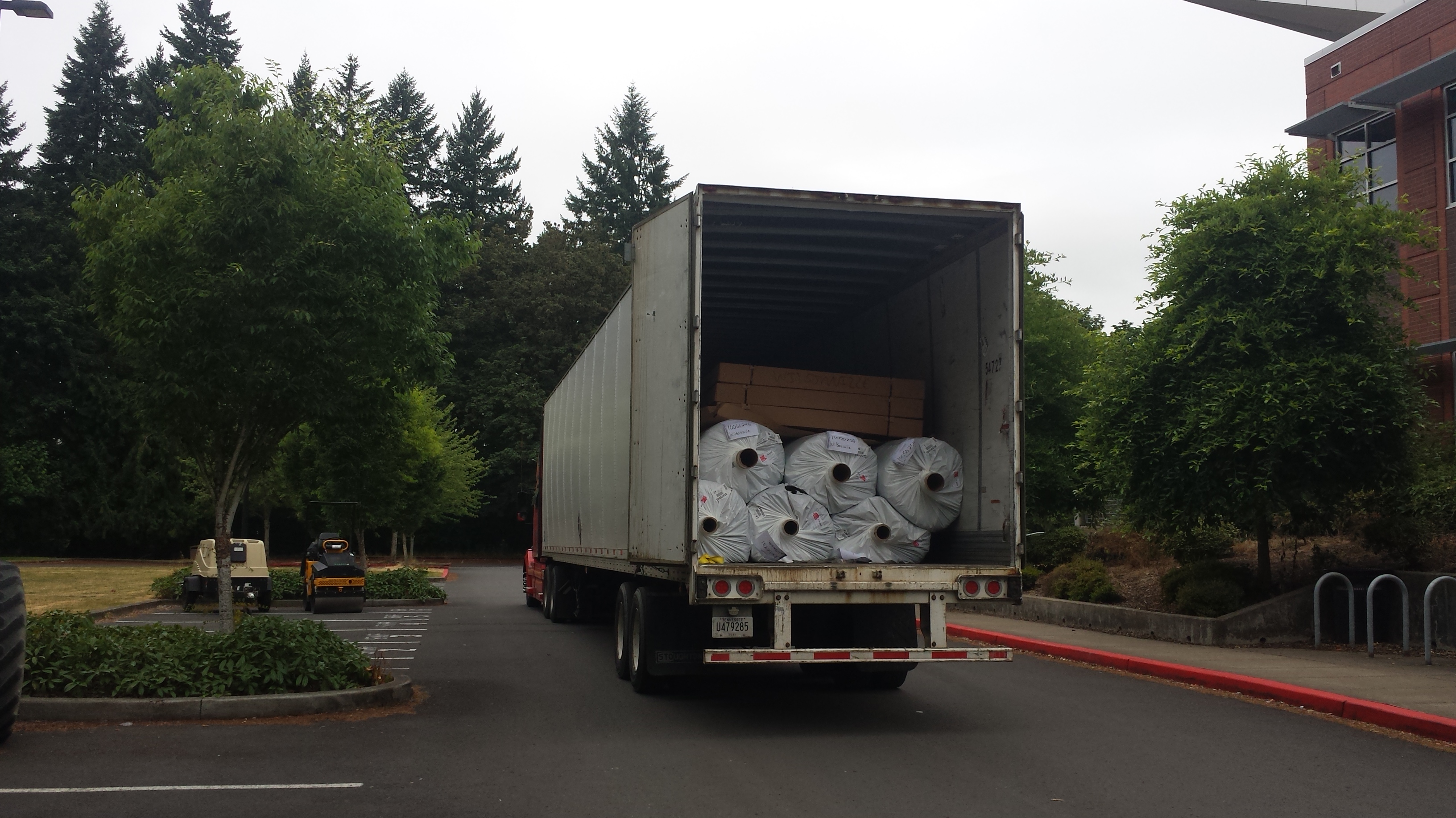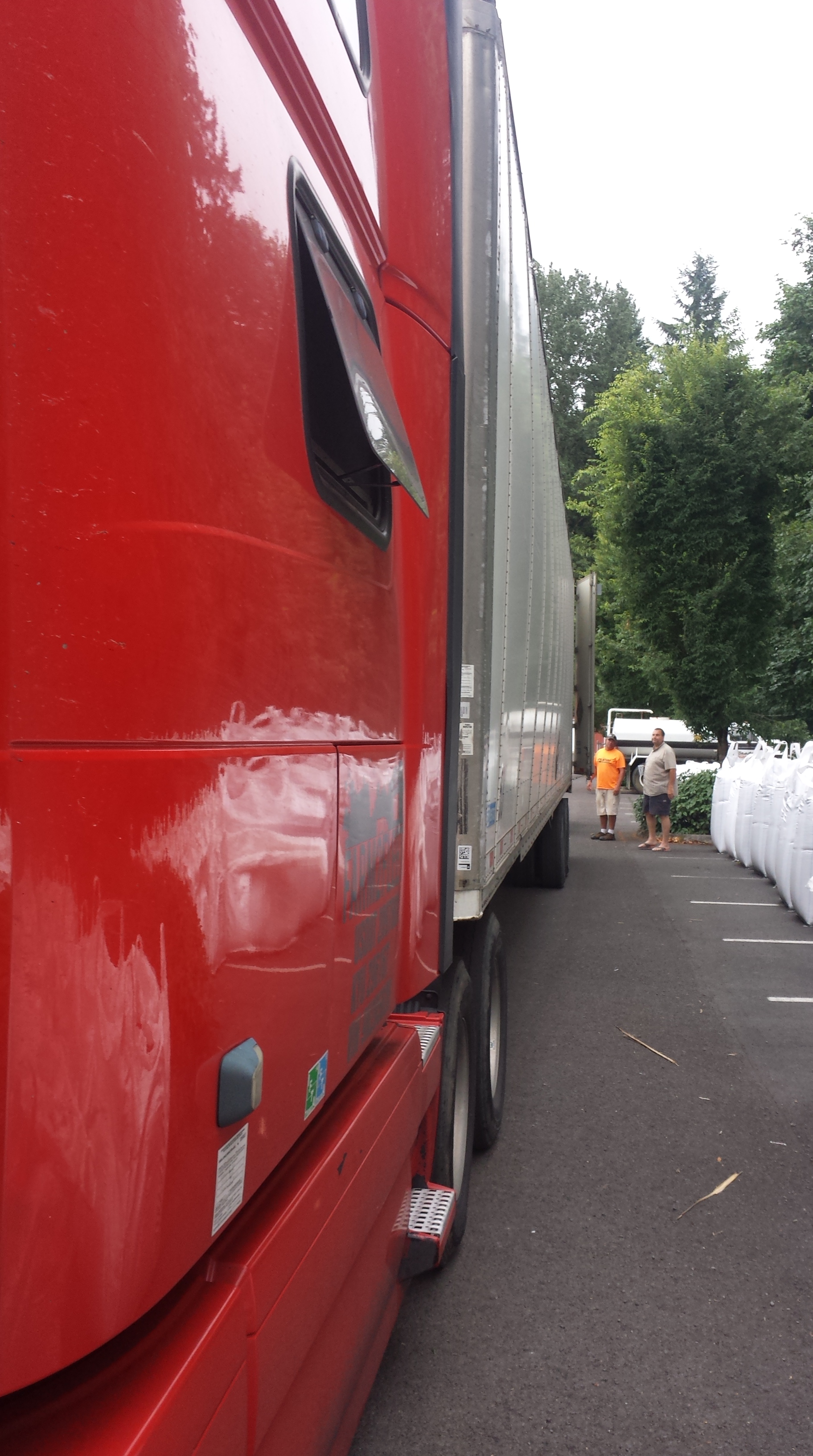 Oh my goodness have we been sick. We are actually working for a living right now and not sitting at home. Got a load of astroturf for the football stadium at Wilsonville Highschool in Oregon. We had a near disaster at the port of entry in Utah. As we rolled over the scales, we got the message “Park, Bring Papers” Usually no big deal. We had 4 level 3 inspections in the last 18 months (the one where they check you logs and all of the trucks paperwork) and we have always been clean. We have never even come close to any kind of violation with the exception of not having the right permit the first time we entered Oregon as Owner Operators. That was a $430 ticket that Anne got reduced to $200 (and Farm2Fleet paid for us) So as I am gathering my wallet, our permit book, our logs and the bill of lading the DOT officer comes out and looks down both sides of our truck. We cannot figure out what she is doing but she is gone before I get out. I walk in and she is waiting at the counter for me. I ask her what she was looking at and she says it looks like we are too wide. What???? Because we are hauling rolls of astroturf (just like rolls of carpet) the sides of the trailer are bulging a bit. This always happens with carpet and we have never had an issue in the past.
