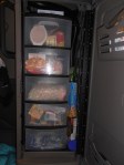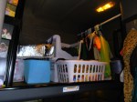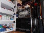(12/03/2011)  Most curret iteration of our truck setup.  The first six pictures are the new ones.  We totally changed the upper bunk area with the exception of the refer.  We put in a rack and moved the microwave up and added a toaster oven.  New bins along the back.  THEN, we bought a 22″ flat screen tv and I built a frame for it so we could hang it at the foot of the bed using the strap for the refer.  I am a bit frustrated by the frame since I no longer own a shop and all my tooks are in storage.  Built with a skill saw and a screwdriver.  Not bad for what it is.  I bought an HDMI cable so we now have Netflix through my phone connected to the TV.  Pretty sweet setup.